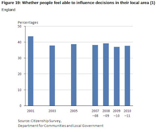 The Office for National Statistics has published figures for national wellbeing, which show which parts of the UK are happiest, most relaxed and most fulfilled. The BBC summarises with a table of the top and bottom 5 places for each statistic. It turns out that the remoter parts of Scotland are the most laid back. There are a number of interesting graphs including this one which shows how much people think they can influence local decisions: